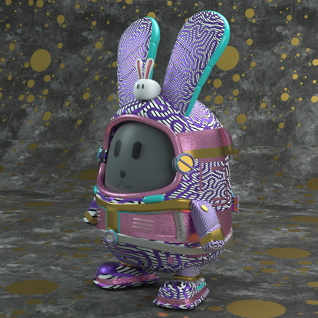 直译为《兔子洞》,源自《爱丽丝梦游仙境》,比喻通往奇幻新世界的入口。 电影《黑客帝国》中的“矩阵”可谓是将元宇宙进一步具象化,一个平行于真实生活的虚拟世界。系类作品的名称也是引用电影中的经典台词"This is your last chance. After this, there is no turning back You take the blue pill-the storyends, you wake up in your bed and believe whatever you want to believe. You take the red pill-you stay in Wonderiand and I show you how deep the rabbit hole goes." — Morpheus,The Matrix 系列作品极具象征意义,它标志着通向元宇宙的大门,作品以兔子为基本型进行设计,采用3D建模塑造出身着宇航服的兔子形象,探索元宇宙。Follow the rabbit!